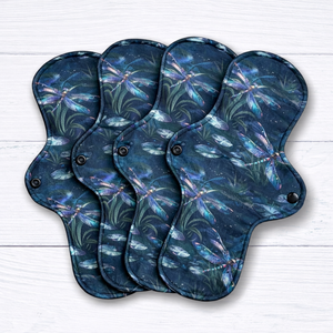 Welcome to Amie Active! If you are looking for reusable pads that are super-easy care, you're going to love these pads! This set features a gorgeous dragonfly print with all the same benefits of our original Amie Active.