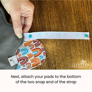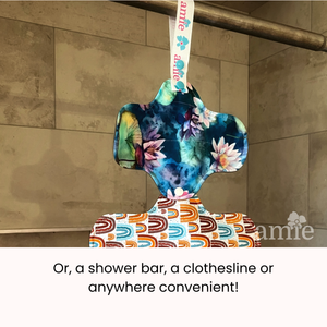 Simply snap it around a shower rod, a door knob, a clothesline, a drying rack...really, anywhere you want your pads to hang to dry. Snap one pad or several in a chain to the strap and let them dry.